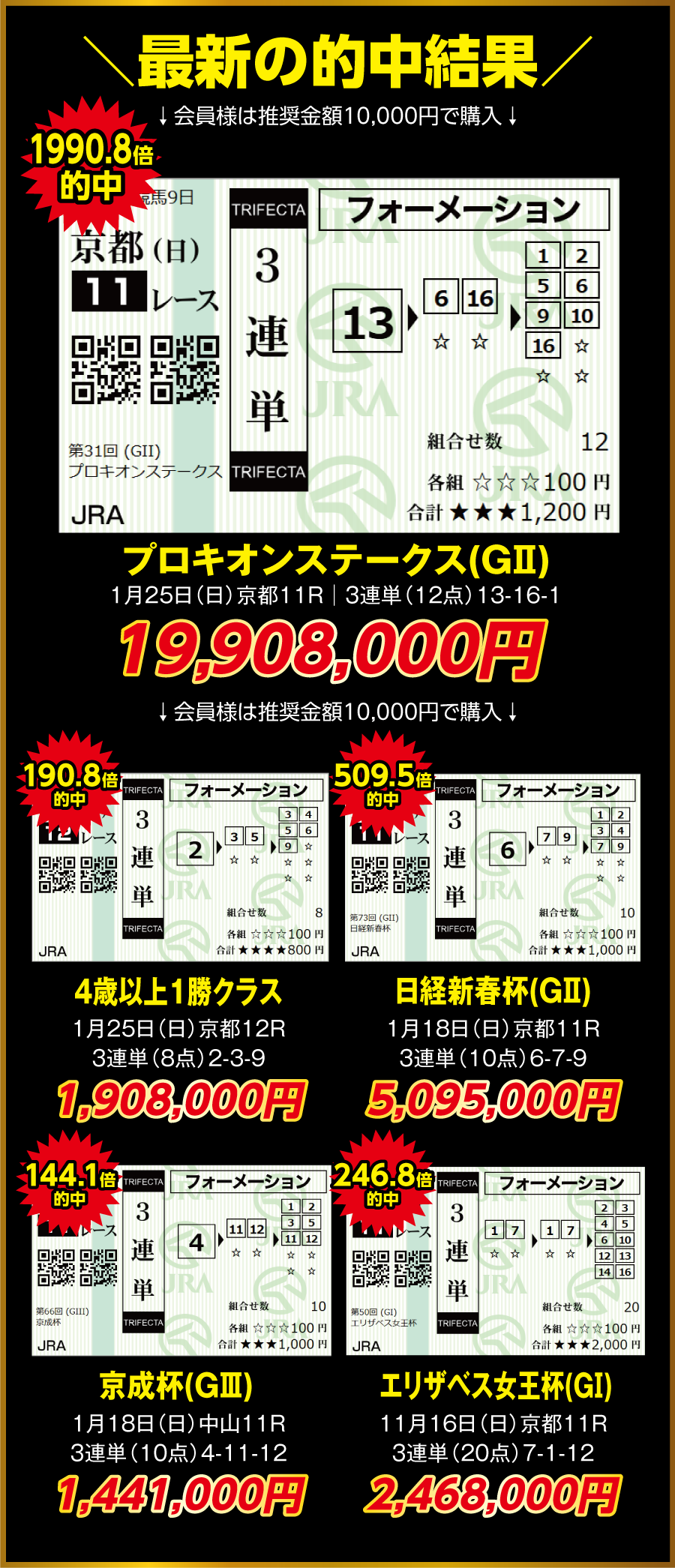 掲載の的中実績は、推奨の金額通りに購入していた場合の試算金額で掲載しております。レースの売上額やオッズ変動の関係で実際の払戻金額とは異なる可能性があります。