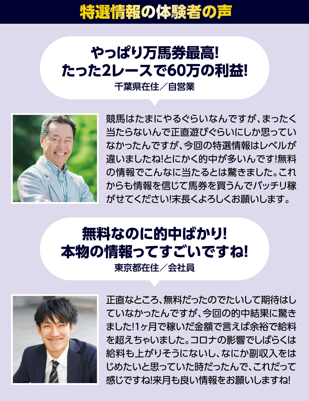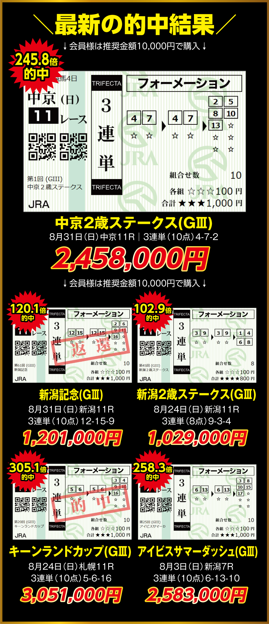 掲載の的中実績は、推奨の金額通りに購入していた場合の試算金額で掲載しております。レースの売上額やオッズ変動の関係で実際の払戻金額とは異なる可能性があります。